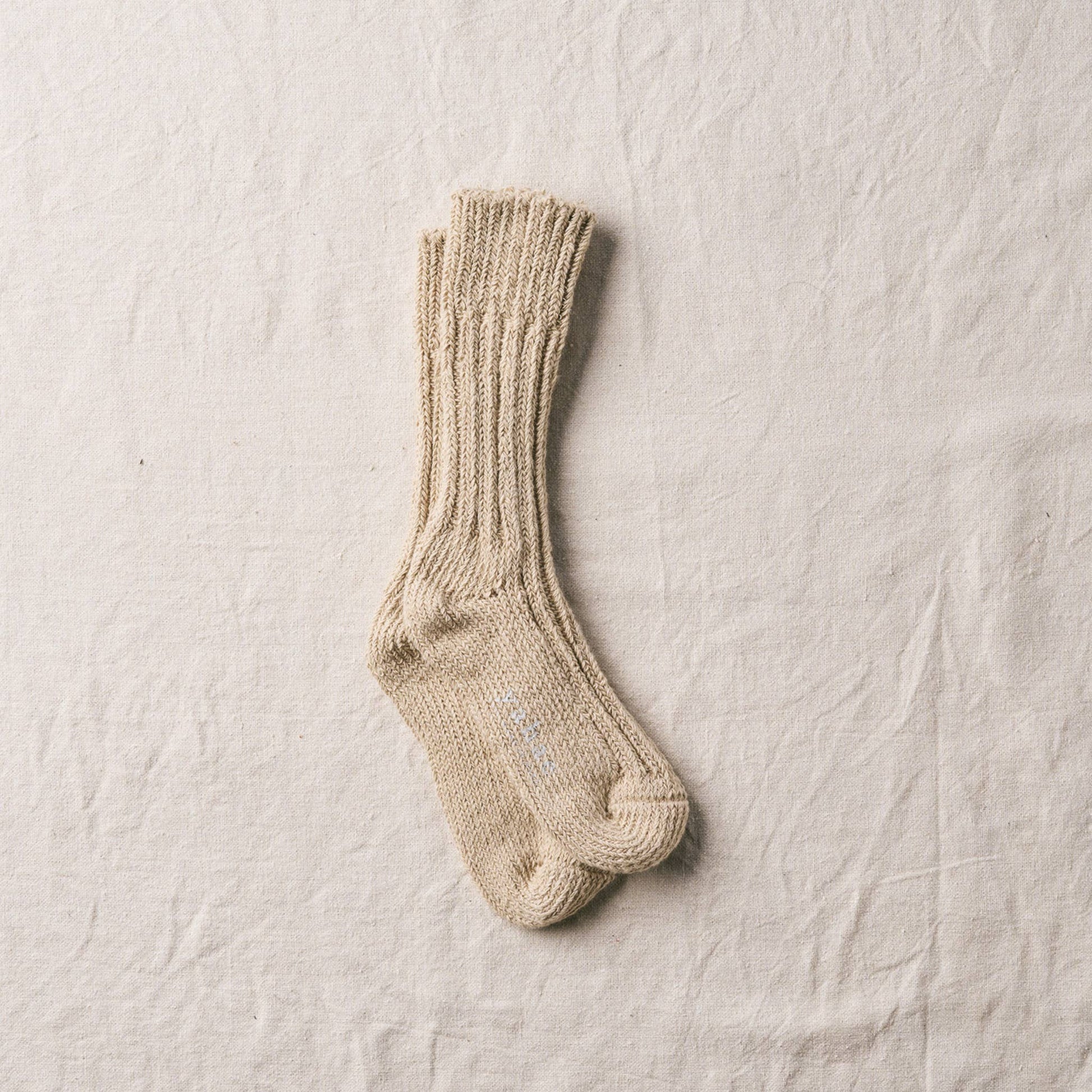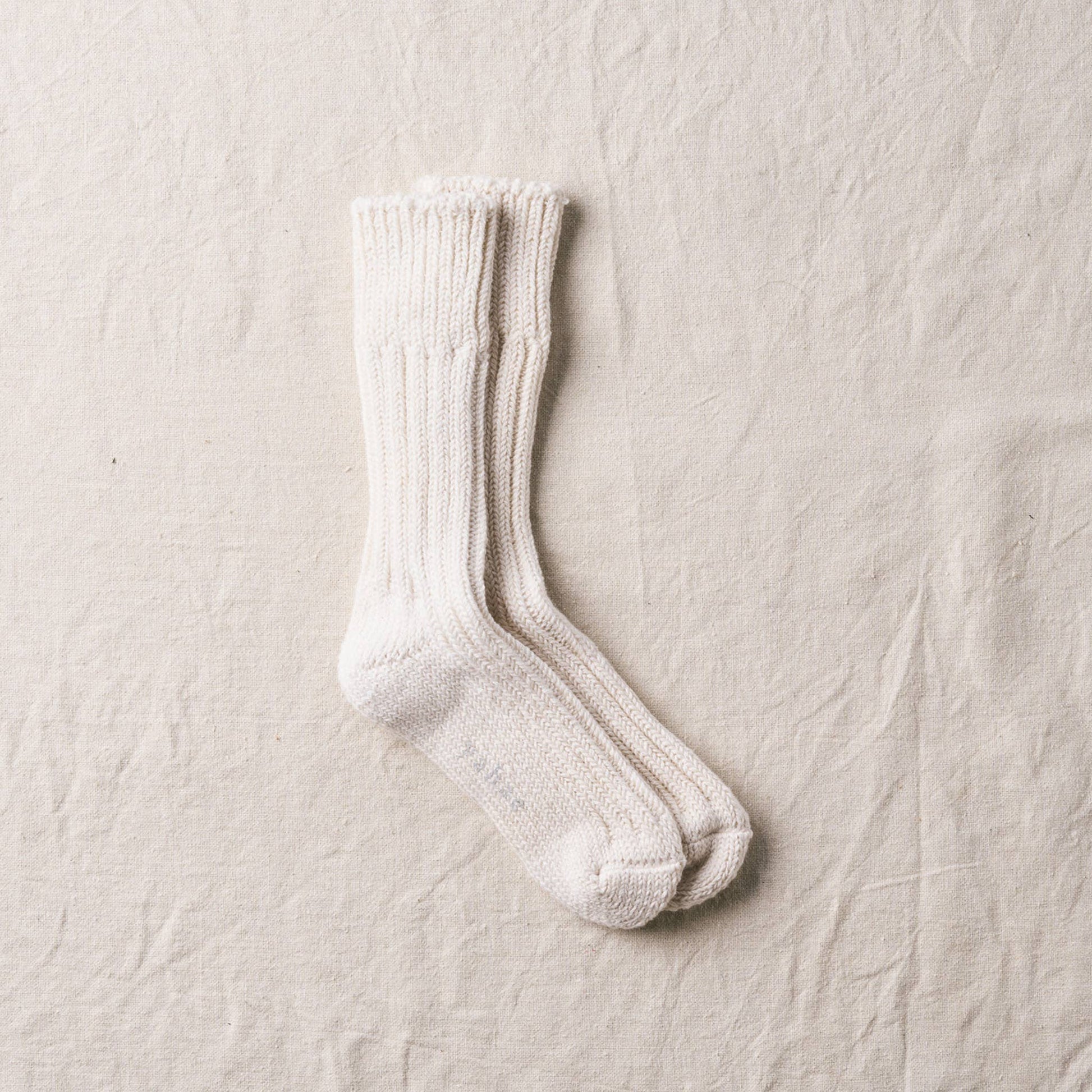 These low-gauge socks with a classic texture are knitted on a vintage machine from Bentley, England. The socks are knitted slowly using plenty of yarn and have a gentle hand-knit feel. You can enjoy the different comfort that each cotton offers depending on the color of socks you choose.